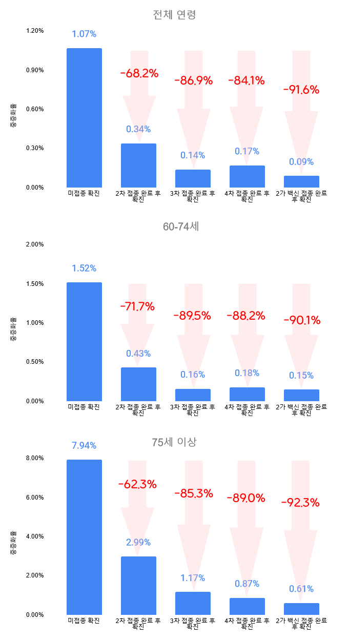 2가 백신 접종 완료하면 접종 후 확진되더라도 미접종자¶)에 비해 중증 진행 위험 91.6% 감소
