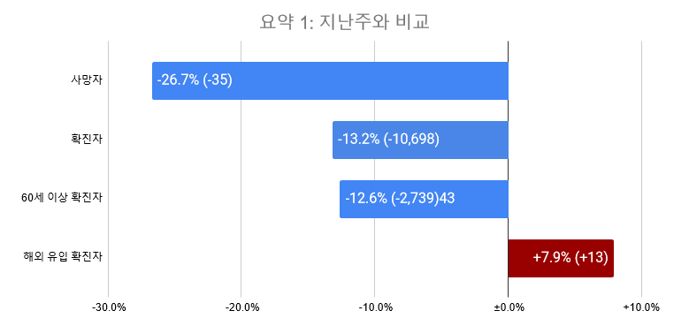 지난주 대비 국내 발생 -10,711 (-14.4%) / 해외 유입 +13 (+7.9%)