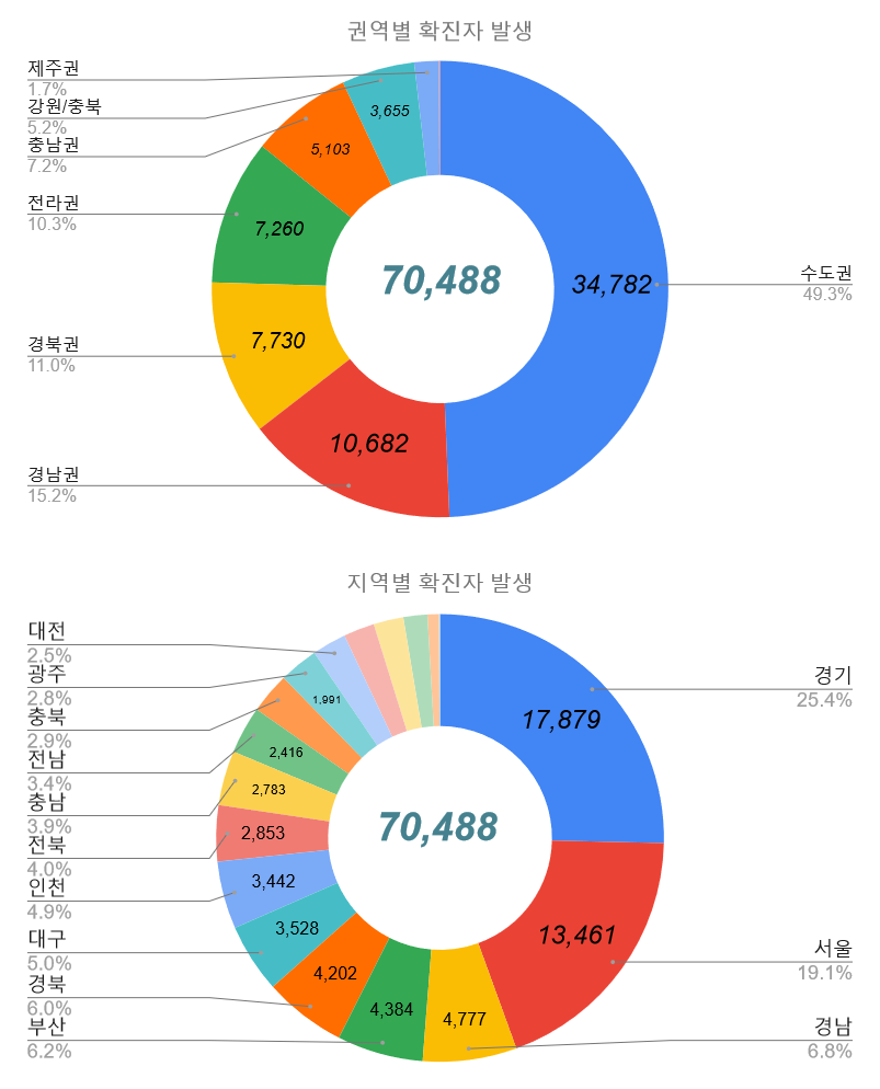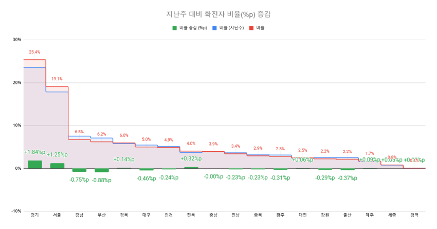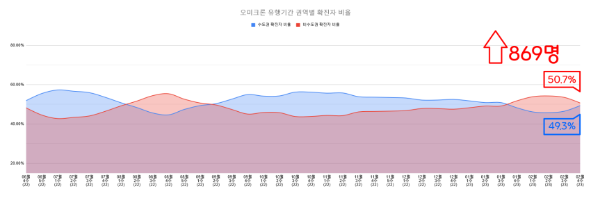 5주 연속 비수도권 확진자 수가 수도권 확진자 수를 초과함 (869명)