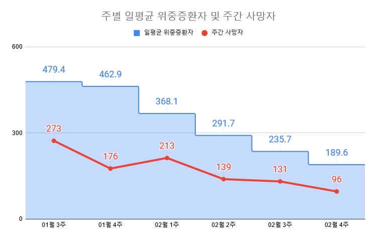 일평균 위중증 환자 189.6 (-46.1) / 주간 사망 합계 96 (-35)