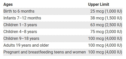 한편, 미 FDA에서 권고하는 비타민 D의 일일 섭취 권고량과 제한량은 아래와 같습니다.